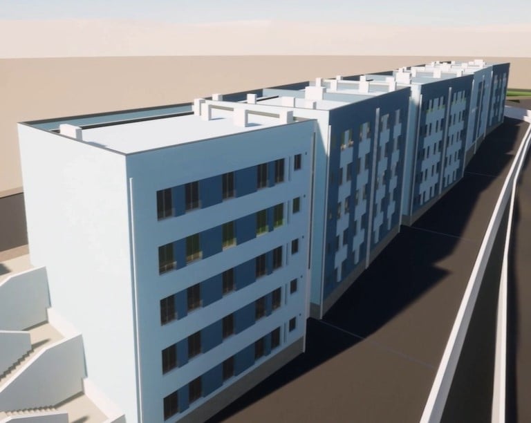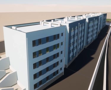 A empreitada implica a construção de um edifício residencial, com uma área de implantação de 1.444 metros quadrados e 5.668 metros quadrados de área total de construção. Desenvolvido em cinco pisos, o edifício conta com 61 habitações, 46 de tipologia T2 e 15 de tipologia T3, distribuídas por quatro blocos habitacionais.